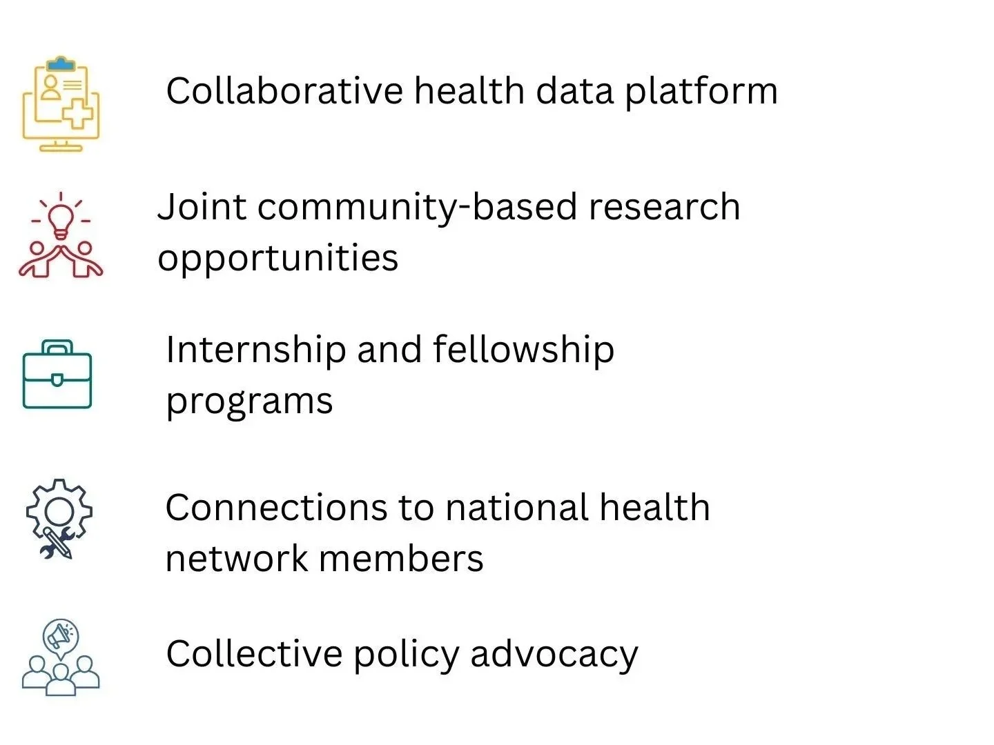 We collaborate with clinics and Federally Qualified Health Centers that serve diverse and often underserved populations. These front-line providers bring critical insight into the social and clinical realities of community health. Through participation in NHHRI, they contribute to a national data platform that helps identify trends, inform care strategies, and connect local innovations to a broader network of research and policy solutions
